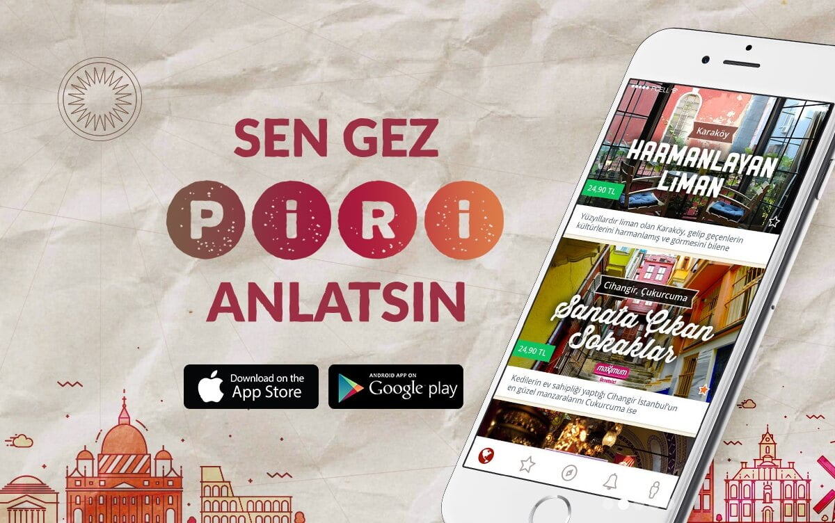 Piri, kültürel anlamdaki gezilerinizde sizlere ‘sesli rehber’ olarak hizmet vermekte. Kulaklığınızı takıp Piri’yi başlatacak ve gezip dolaştığınız bölge hakkında bilgi sahibi olacaksınız. Turist rehberi ile birlikteymişsiniz gibi gezeceksiniz. Hem nereyi ne kadar gezeceğinize dair seçim size kalacak hem de Saffet Emre Tonguç, Ali Canip Olgunlu ve Vedat Milor gibi dev isimlerin anlatımlarıyla geziniz daha da farklı ve eğlenceli bir hal alacak.